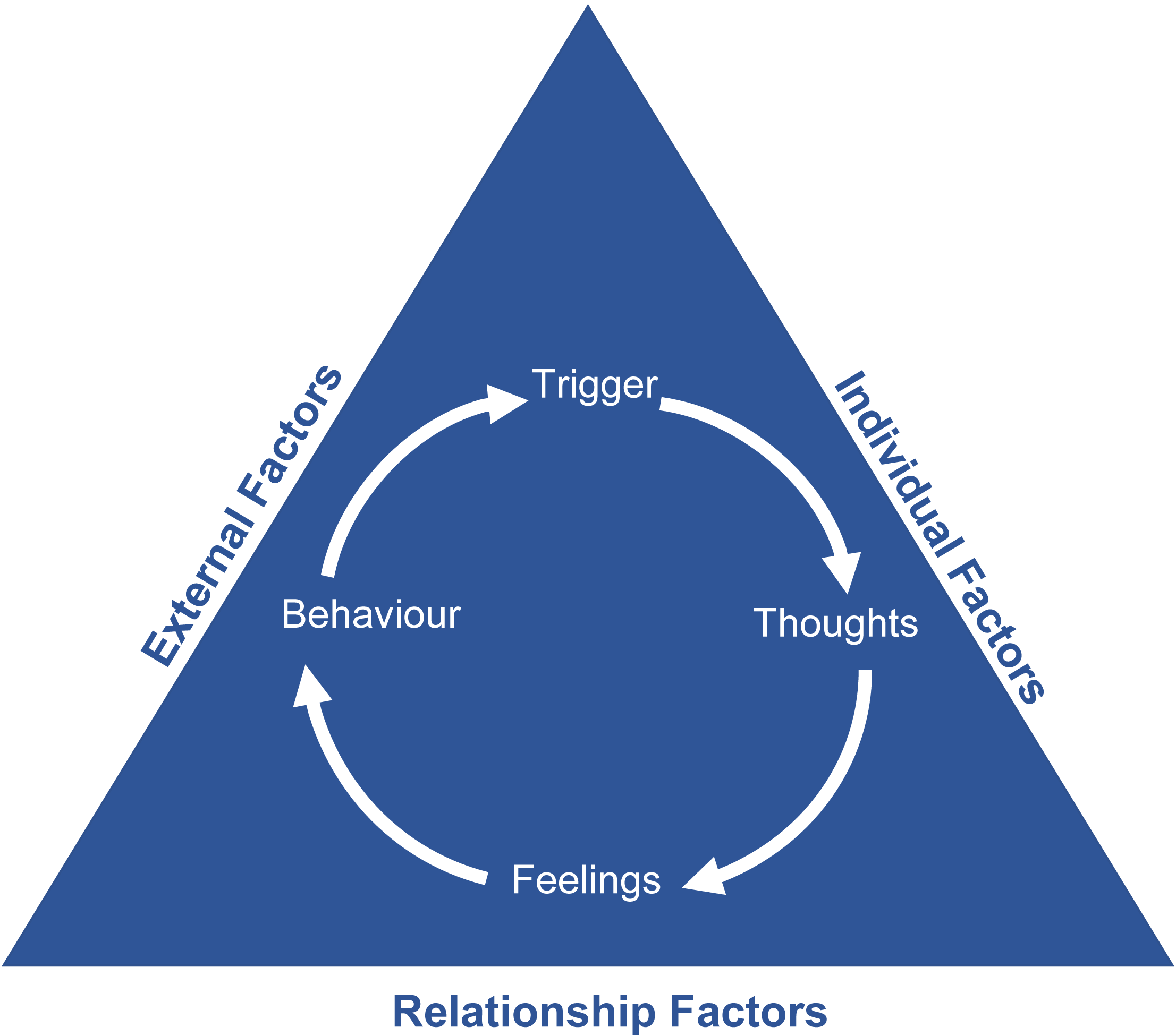 - Using the CBT for couples model to explore the interdependencies between external factors, triggers, thoughts, feelings and behaviours.